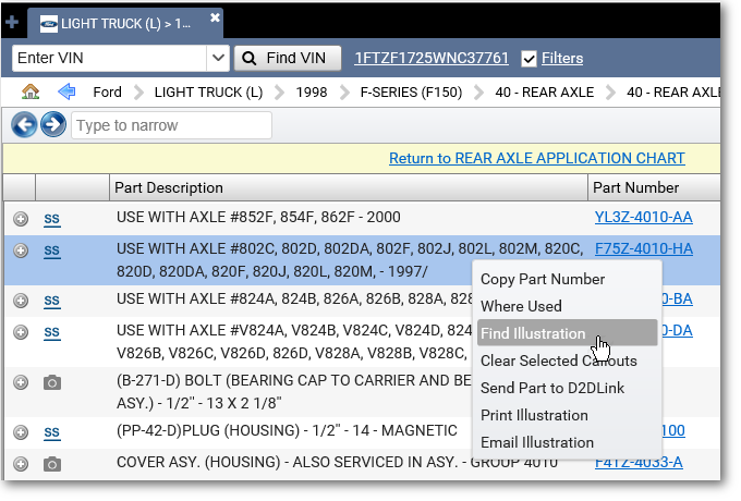 - To see an illustration of a part, right-click the part and select Find Illustration.